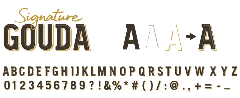 Een bestaand lettertype is aangepast aan het logodesign. In dit voorbeeld is hier een zogenaamd ‘layerd-font’ van gemaakt met de binnenschaduw en buitenschaduw. Op deze manier kunnen met het ontworpen font alle tekst- en kleurcombinaties worden gebruikt in de diverse designtoepassingen.